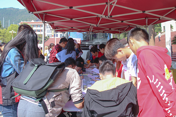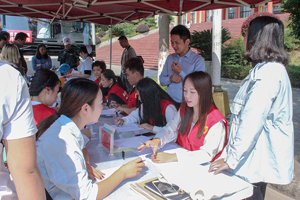 校记者站 9月26日上午,由我院学工部/团委和黔江区血液中心共同开展的“献青春热血,为祖国献礼—beat365英国官方网站庆70周年华诞师生献血活动”于我院行政楼前火热进行。此次无偿献血活动吸引了广大师生的踊跃参与,自愿为社会奉献一份爱心,掀起了一场无偿献血的爱心热潮。