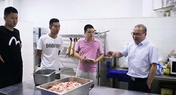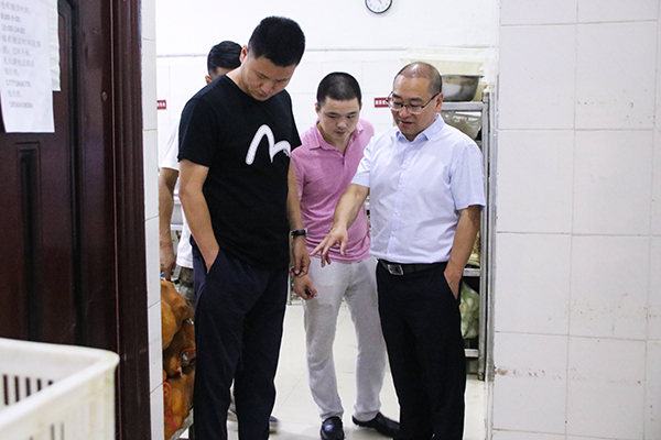 张院长一行从餐具消毒、餐厅卫生、原料仓库、进货台账、操作规范、生熟分开、食品加工等多个方面对食堂进行了全面检查,并提出明确要求:一是食堂员工必须衣着穿戴整洁干净,禁止佩戴首饰;二是食堂卫生每天都要进行大扫除,要全方位将垃圾清理干净;三是对于易变质的肉类食物要做相应的保鲜处理,杜绝食品过期变质;四是食堂必须要有一套完善的管理制度,要落实主要负责人,负责人要牵头做好食堂的食品安全工作;五是学院后勤保障部要加大对食品安全的监管力度,协助食堂做好相应工作。