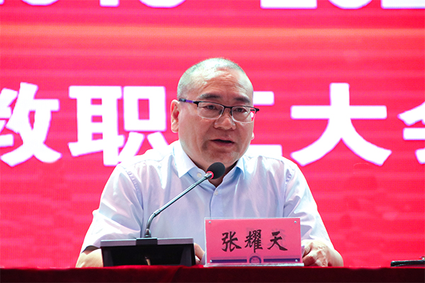 院长张耀天指出,在肯定成绩的同时,还须清晰地认识到学院工作中存在的一些不容忽视的不足问题和差距,在今后的工作中要认真加以解决。并从强力推进党建工作,进一步提升保障力;强力推进依法管理,进一步提升管理力;强力推进改革创新,进一步提升内动力;强力推进硬件建设,进一步提升基础力;强力推进质量提升,进一步提升培养力;强力推进队伍建设,进一步提升支撑力;强力推进民生需求,进一步提升共享力;强力推进规模发展,进一步提升影响力;强力推进社会服务,进一步提升贡献力九个方面安排部署了新学年重点工作。同时,他还希望,全体教职工务必要加强学习、振奋精神、严守规矩、珍惜岗位、勇于担当,努力将自己锻造成一名忠诚岗位、忠诚事业发展的国维教育人,为经贸学院和我们自己的美好明天共同努力奋斗。