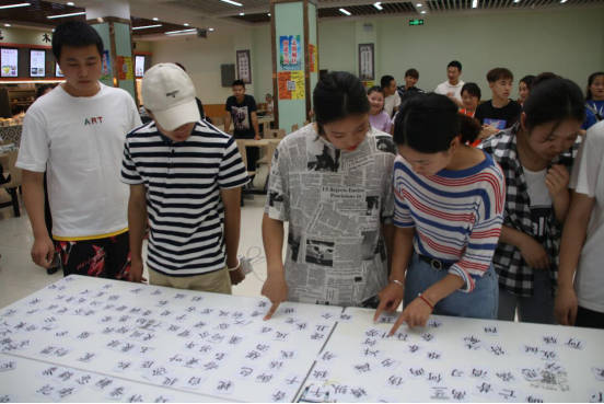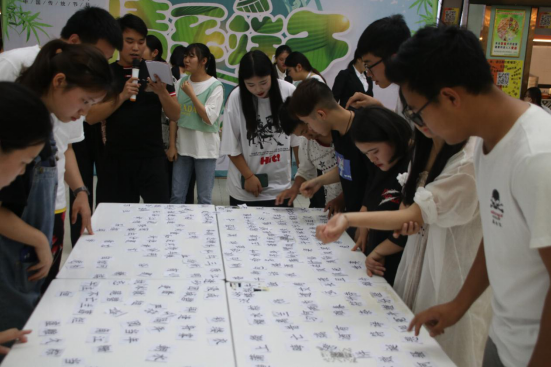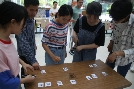 第一个环节“火眼金睛——诗词寻找大赛”,规则是:同学们从散乱字区取字重组为诗,先选出正确的诗句的一组为胜。随着主持人“我宣布诗词寻找大赛开始”,同学们便济济一堂围在摆放着散乱字符的方桌快速挑选起心中诗篇所缺字符,忙得不亦乐乎,取完字飞奔到自己小队的方桌上重组放好,现场节日氛围浓厚。