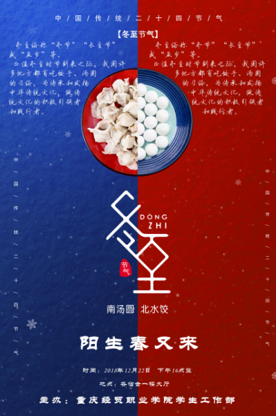 按照最古老的说法,冬至象征着旧一年的结束、新一年的到来。在这寒冷的季节里,暖心的活动让同学们感受到学校的温暖;在“冬至阳生春又来”的美好祝愿下,同学们相互表达着对来年生活的美好期盼。在弘扬和传承中华传统文化的同时,本次活动让同学们将文化自信的认知和认同“内化于心外化于行”,更让传统节日在同学们的生活中重新活跃起来。