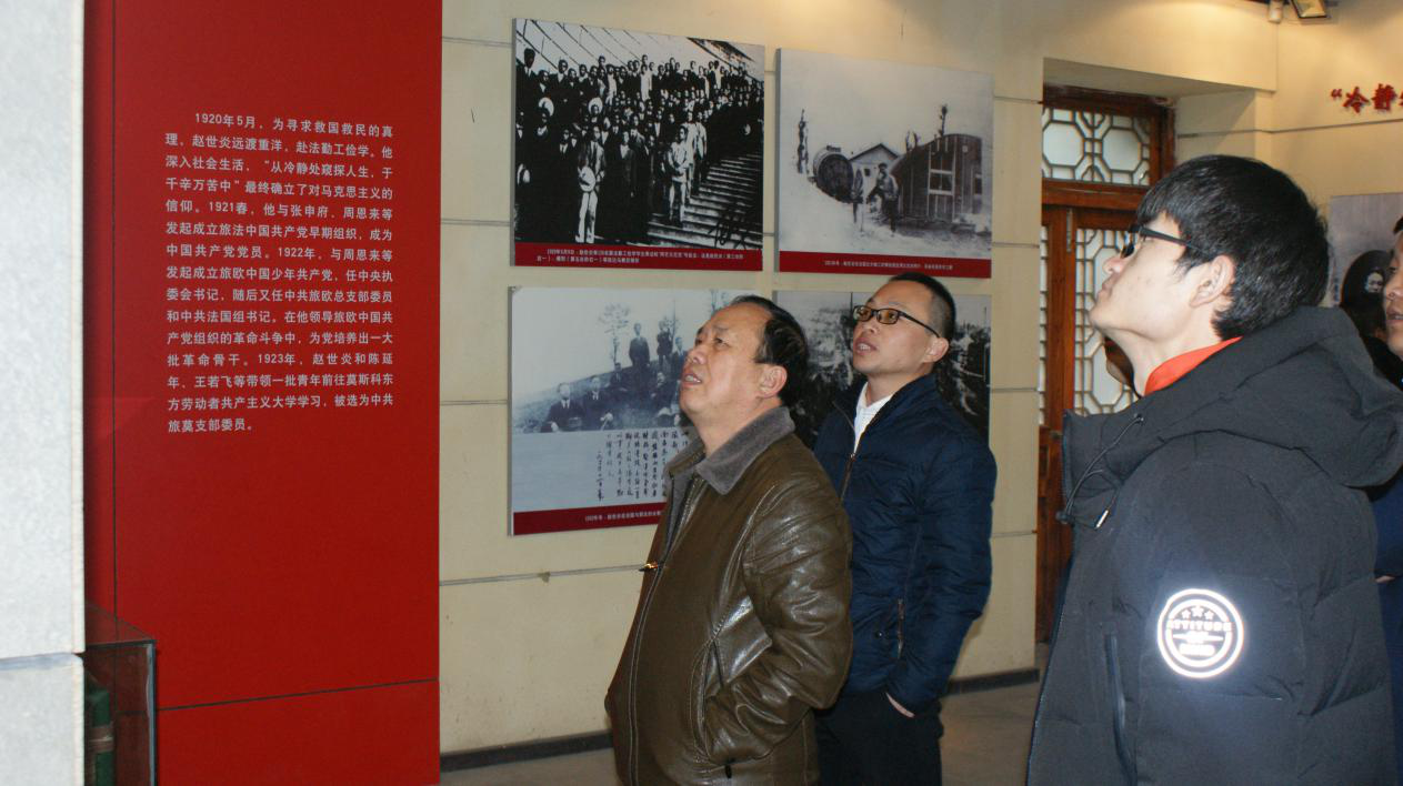 一、参观红色基地。或驻足、或踟蹰、或扼腕、或振奋、或沉思、或阔论,陈列馆内的一件件展品化身岁月的画卷触动着在场同志的心弦。赵世炎的一生是短暂的,出身大户、年少求学、追求真理、领导工运、献身革命,时间定格在那个璀璨的年华;他的一生又是漫长的,在对马克思主义信仰和共产主义理想的执着追求中,他将那一刹化为永恒,永远地激励、启示后来人:人生的意义在于为多数人的福祉而奋斗。