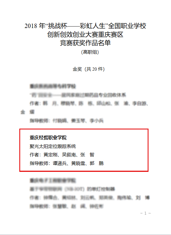 我院师生喜获2018年“挑战杯——彩虹人生”|全国职业学校创新创效创业大赛重庆赛区金奖