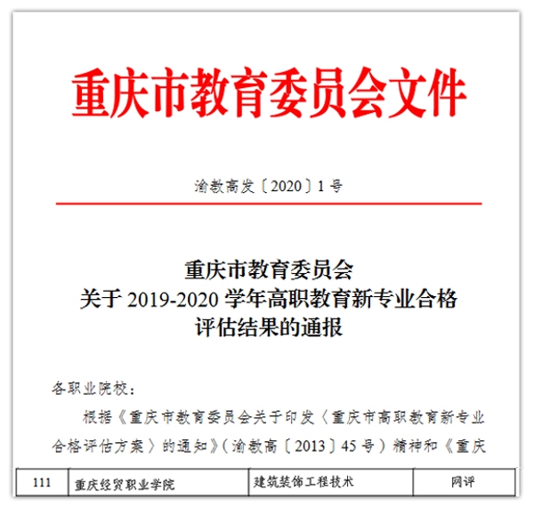 近日,重庆市教委下发《重庆市教育委员会关于2019-2020学年高职教育新专业合格评估结果的通报》(渝教高发〔2020〕1号),在2019年对全市36所高职(专科)院校129个高职新专业评估工作中,我院应用工程学院建筑装饰工程技术专业顺利通过合格评估。