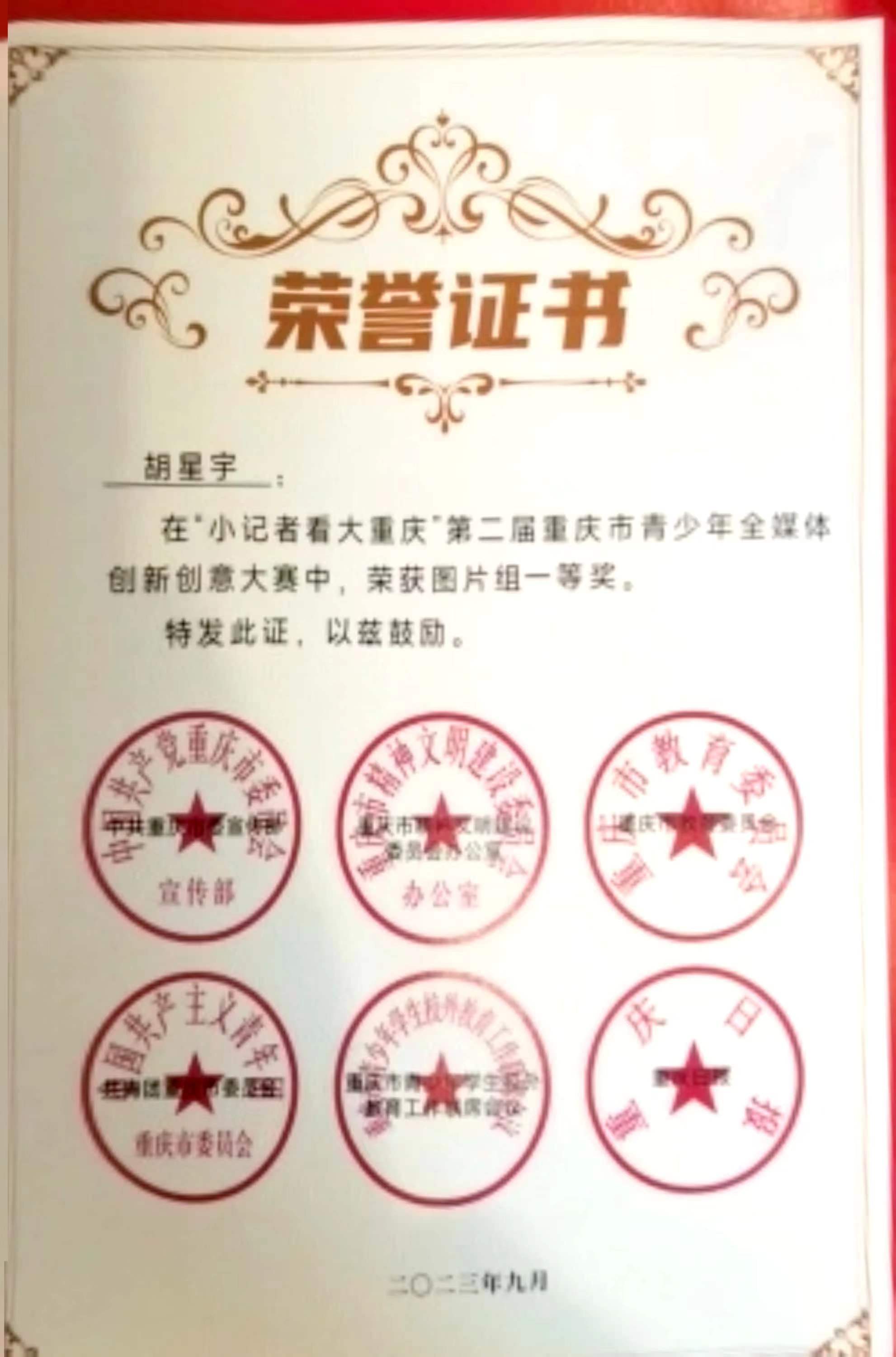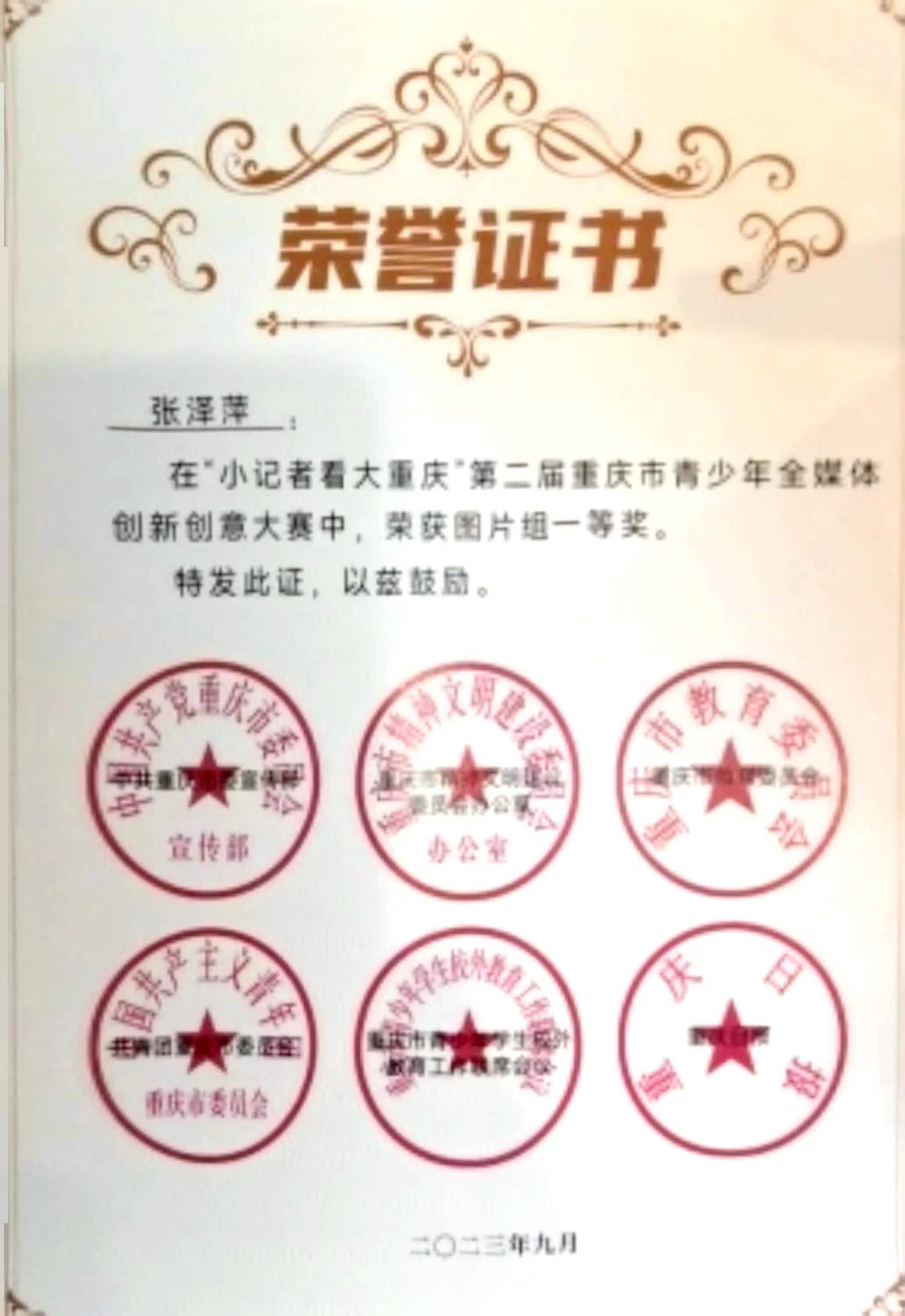 张唐梦旭同学荣获“小记者看大重庆”第二届重庆市青少年全媒体创新创意大赛——图片组二等奖。